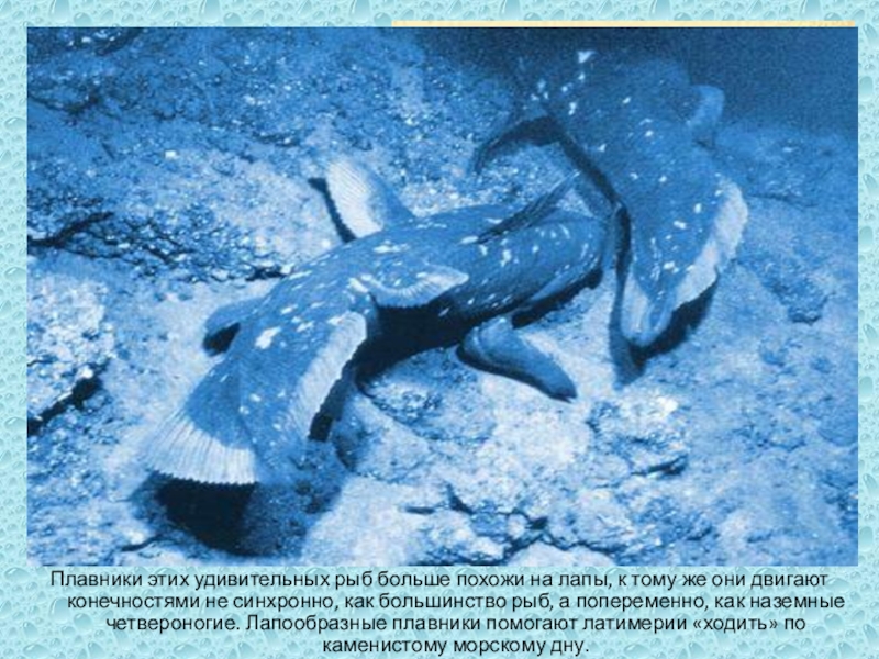 же они двигают конечностями не синхронно, как большинство рыб, а попеременно, как наземные четвероногие. Лапообразные плавники помогают латимерии «ходить» по каменистому морскому дну.