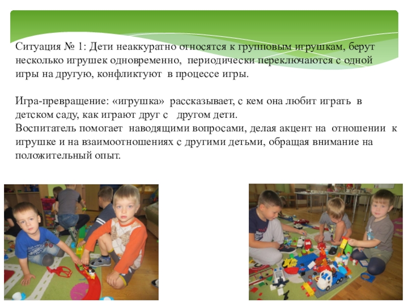 Слайд 11Ситуация № 1: Дети неаккуратно относятся к групповым игрушкам, берут несколько