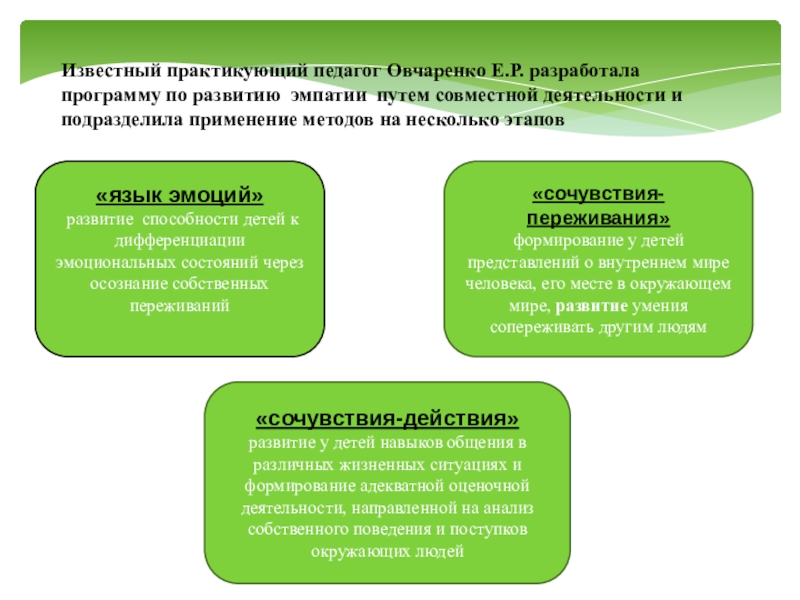 Слайд 8Известный практикующий педагог Овчаренко Е.Р. разработала программу по развитию эмпатии путем