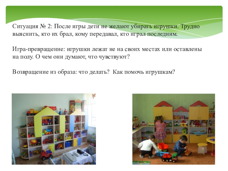Слайд 13Ситуация № 2: После игры дети не желают убирать игрушки. Трудно