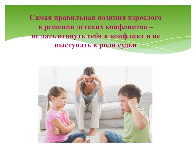 Слайд 4Самая правильная позиция взрослого в решении детских конфликтов –