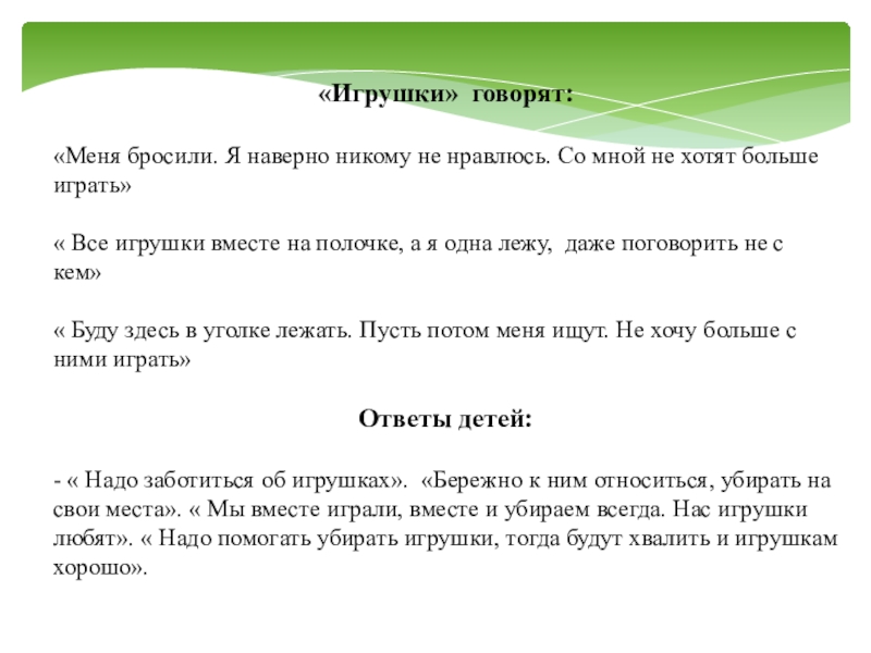 - « Надо заботиться об игрушках». «Бережно к ним относиться, убирать на свои места». « Мы вместе играли, вместе и убираем всегда. Нас игрушки любят». « Надо помогать убирать игрушки, тогда будут хвалить и игрушкам хорошо».