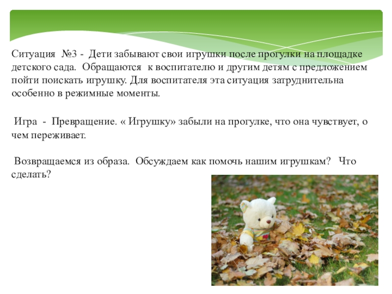 Слайд 15Ситуация №3 - Дети забывают свои игрушки после прогулки на площадке