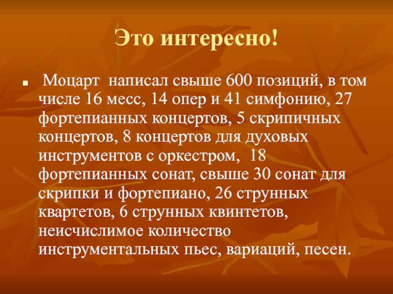 Моцарт написал свыше 600 позиций, в том числе 16