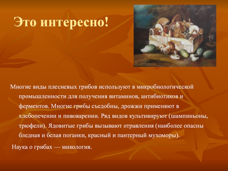 витаминов, антибиотиков и ферментов. Многие грибы съедобны, дрожжи применяют в хлебопечении и пивоварении. Ряд видов культивируют (шампиньоны, трюфели). Ядовитые грибы вызывают отpавления (наиболее опасны бледная и белая поганки, красный и пантеpный мухомоpы).
