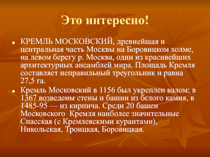 Кремль Московский в 1156 был укреплен валом; в 1367 возведены стены и башни из белого камня, в 1485-95 — из кирпича. Среди 20 башен Московского Кремля наиболее значительные Спасская (с Кремлевскими курантами), Никольская, Троицкая, Боровицкая.