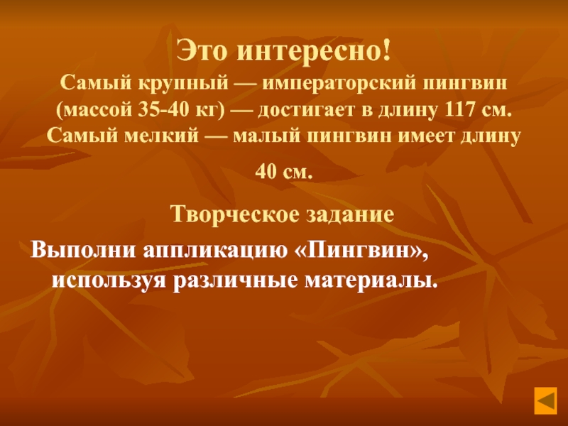 Самый крупный — императорский пингвин (массой 35-40 кг) — достигает
