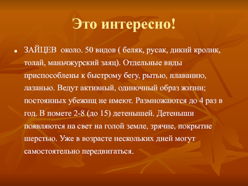 маньчжурский заяц). Отдельные виды приспособлены к быстрому бегу, рытью, плаванию, лазанью. Ведут активный, одиночный образ жизни; постоянных убежищ не имеют. Размножаются до 4 раз в год. В помете 2-8 (до 15) детенышей. Детеныши появляются на свет на голой земле, зрячие, покрытие шерстью. Уже в возрасте нескольких дней могут самостоятельно передвигаться.