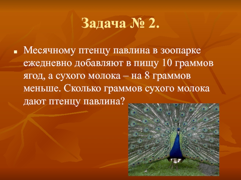 10 граммов ягод, а сухого молока – на 8 граммов меньше. Сколько граммов сухого молока дают птенцу павлина?