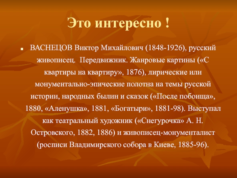 («С квартиры на квартиру», 1876), лирические или монументально-эпические полотна на темы русской истории, народных былин и сказок («После побоища», 1880, «Аленушка», 1881, «Богатыри», 1881-98). Выступал как театральный художник («Снегурочка» А. Н. Островского, 1882, 1886) и живописец-монументалист (росписи Владимирского собора в Киеве, 1885-96).