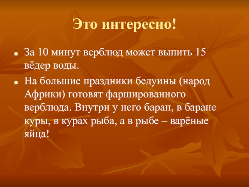 праздники бедуины (народ Африки) готовят фаршированного верблюда. Внутри у него баран, в баране куры, в курах рыба, а в рыбе – варёные яйца!