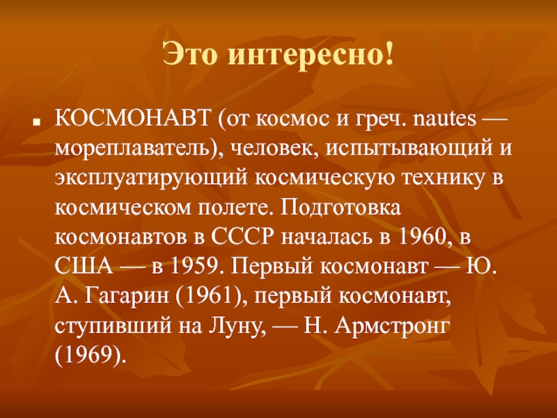 и эксплуатирующий космическую технику в космическом полете. Подготовка космонавтов в СССР началась в 1960, в США — в 1959. Первый космонавт — Ю. А. Гагарин (1961), первый космонавт, ступивший на Луну, — Н. Армстронг (1969).