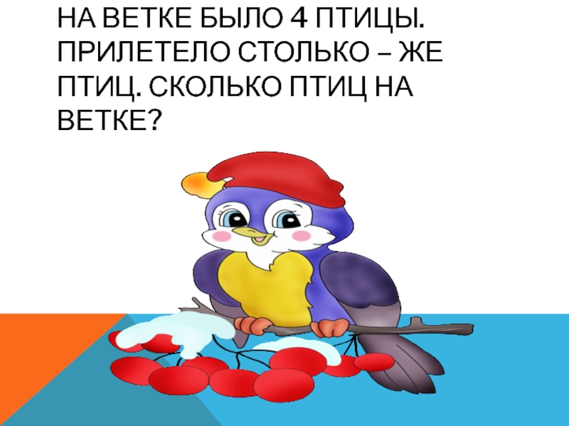 Слайд 9На ветке было 4 птицы. Прилетело столько – же птиц. Сколько