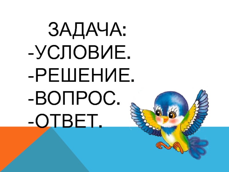 Слайд 3 ЗАДАЧА: -УСЛОВИЕ. -РЕШЕНИЕ. -ВОПРОС. -ОТВЕТ.