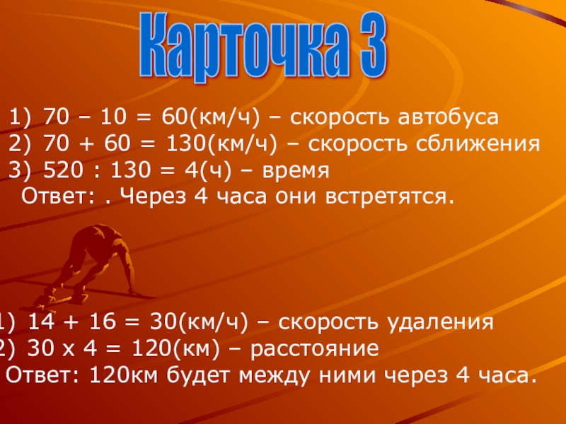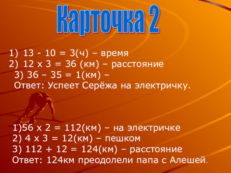 2) 4 х 3 = 12(км) – пешком