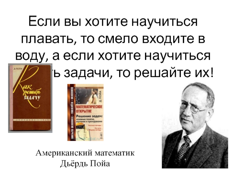 Если вы хотите научиться плавать, то смело входите в воду, а если хотите научиться решать задачи, то решайте их!Американский математик Дьёрдь Пойа