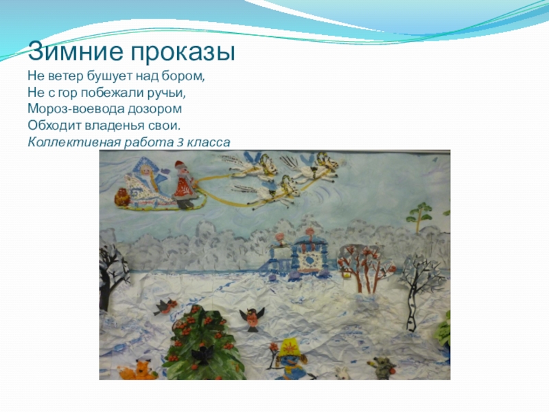 Зимние проказы Не ветер бушует над бором, Не с гор побежали ручьи, Мороз-воевода дозором Обходит владенья свои. Коллективная работа 3 класса
