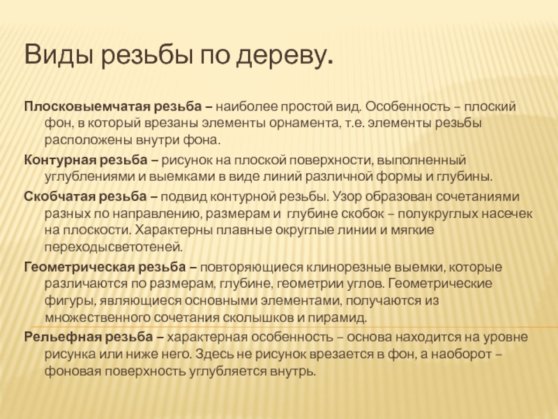 резьба является одним из видов художественной обработки дерева наряду с выпиливанием, токарным делом)