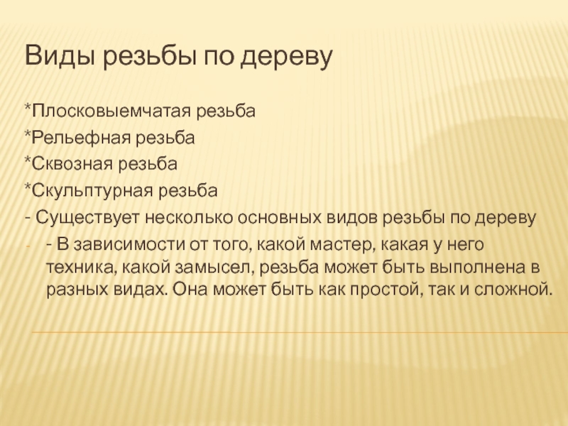 - В зависимости от того, какой мастер, какая у него техника, какой замысел, резьба может быть выполнена в разных видах. Она может быть как простой, так и сложной.