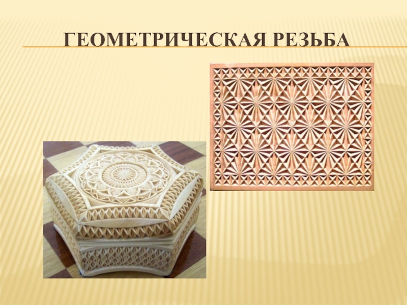 Геометрическая резьба – повторяющиеся клинорезные выемки, которые различаются по размерам, глубине, геометрии углов. Геометрические фигуры, являющиеся основными элементами, получаются из множественного сочетания сколышков и пирамид.