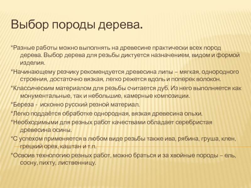 дерева. Выбор дерева для резьбы диктуется назначением, видом и формой изделия.