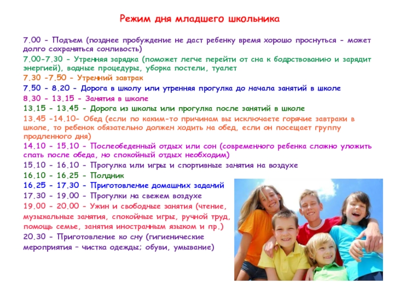 Режим дня младшего школьника7.00 - Подъем (позднее пробуждение не даст ребенку время хорошо проснуться - может долго