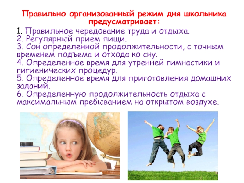 Правильно организованный режим дня школьника предусматривает: 1. Правильное чередование труда и отдыха. 2. Регулярный прием пищи. 3.