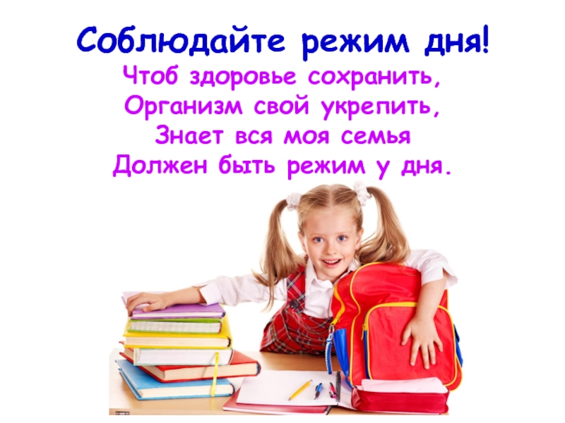 Слайд 3Соблюдайте режим дня! Чтоб здоровье сохранить, Организм свой укрепить, Знает вся моя семья Должен быть