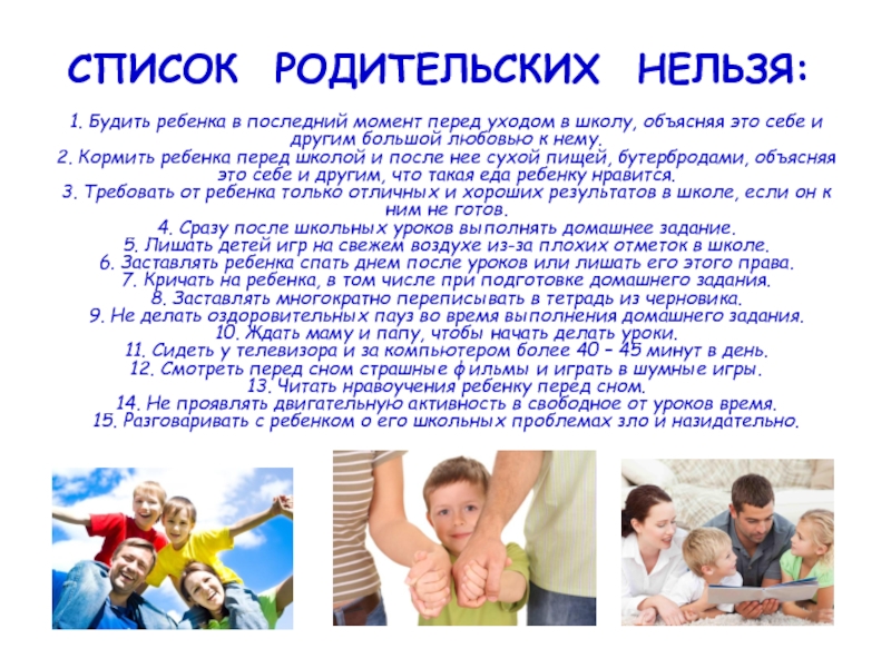 СПИСОК  РОДИТЕЛЬСКИХ  НЕЛЬЗЯ:  1. Будить ребенка в последний момент перед уходом в школу, объясняя это себе