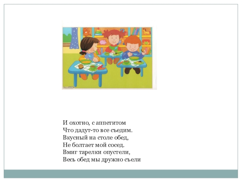 Слайд 8И охотно, с аппетитом  Что дадут-то все съедим.  Вкусный на столе обед,  Не болтает