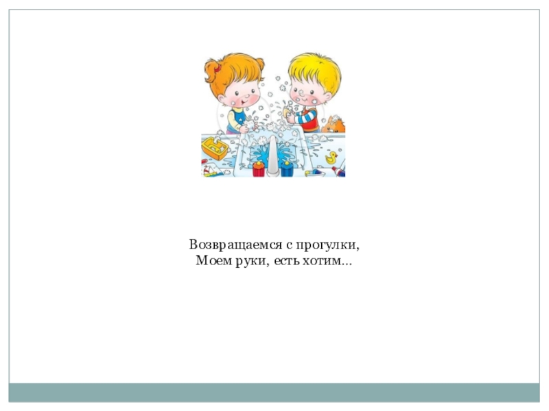 Слайд 7Возвращаемся с прогулки,  Моем руки, есть хотим…