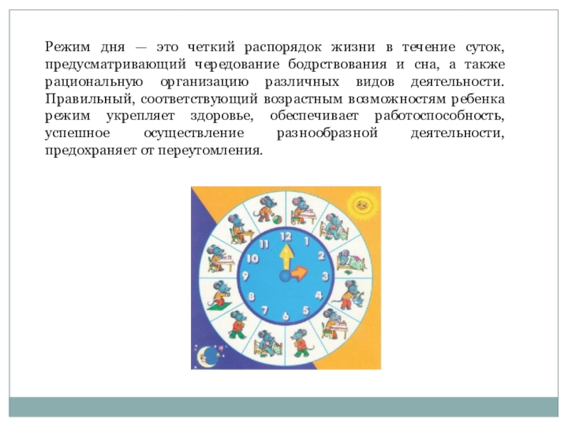 Слайд 2Режим дня — это четкий распорядок жизни в течение суток, предусматривающий