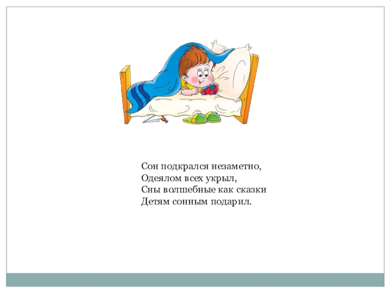 Слайд 9Сон подкрался незаметно,  Одеялом всех укрыл,  Сны волшебные как сказки  Детям сонным подарил.