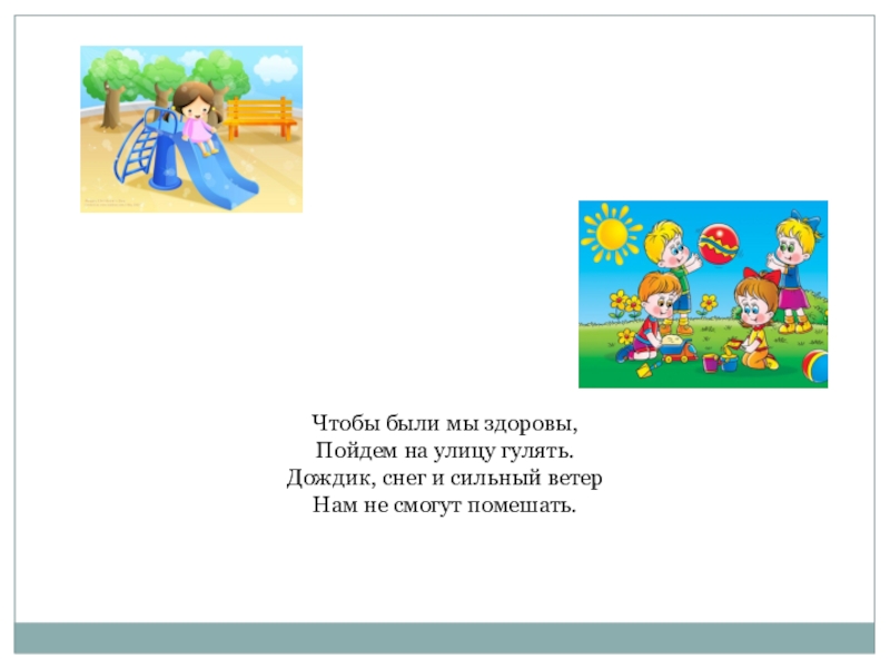 Слайд 6Чтобы были мы здоровы,  Пойдем на улицу гулять.  Дождик, снег и сильный ветер  Нам