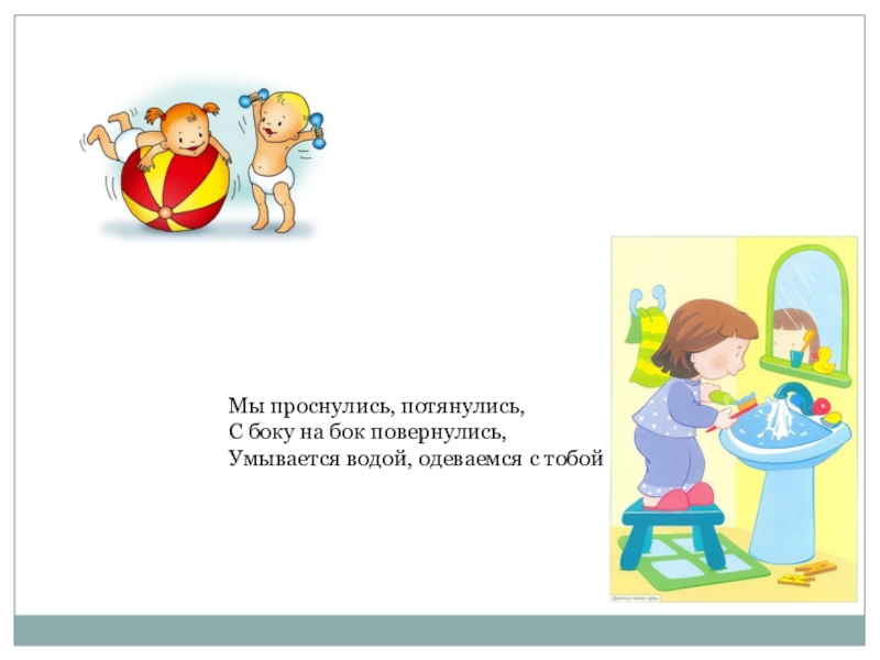 Слайд 10Мы проснулись, потянулись,  С боку на бок повернулись,  Умывается водой, одеваемся с тобой