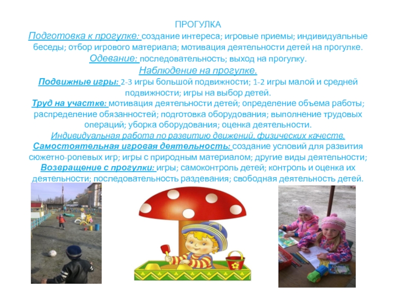 Слайд 7ПРОГУЛКА Подготовка к прогулке: создание интереса; игровые приемы; индивидуальные беседы; отбор игрового