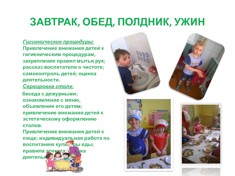 беседа с дежурными; ознакомление с меню, объявление его детям; привлечение внимания детей к эстетическому оформлению столов. Привлечение внимания детей к пище; индивидуальная работа по воспитанию культуры еды; правила этикета; оценка деятельности.