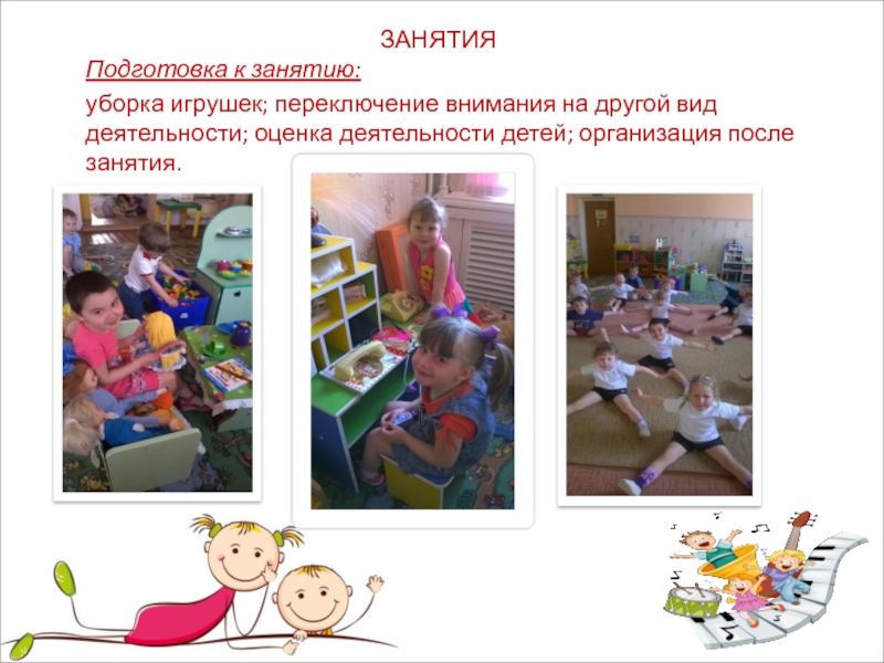 уборка игрушек; переключение внимания на другой вид деятельности; оценка деятельности детей; организация после занятия.