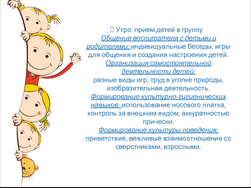 Слайд 2 Утро: прием детей в группу Общение воспитателя с детьми и родителями: