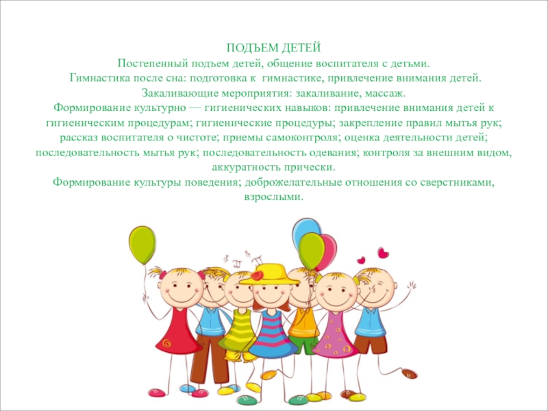Слайд 8ПОДЪЕМ ДЕТЕЙ Постепенный подъем детей, общение воспитателя с детьми. Гимнастика после сна: