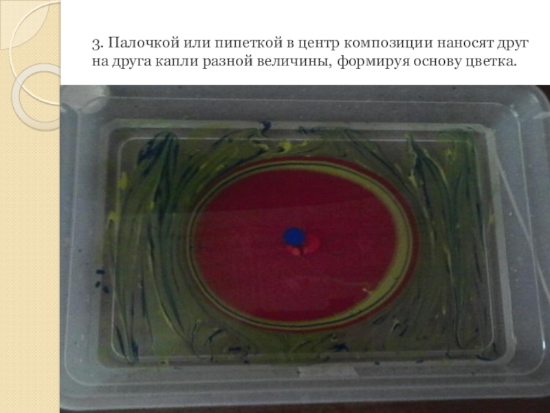 Слайд 93. Палочкой или пипеткой в центр композиции наносят друг на друга