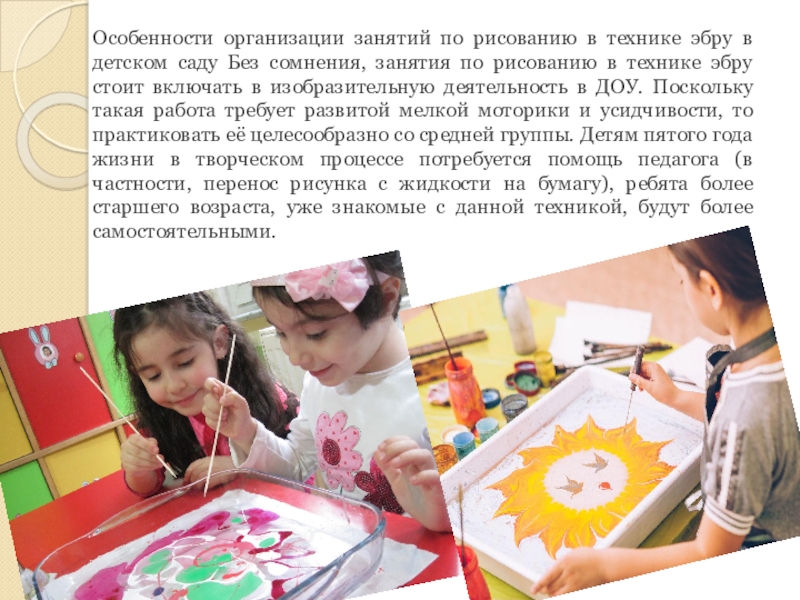 Слайд 6Особенности организации занятий по рисованию в технике эбру в детском саду