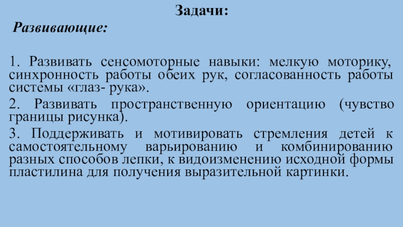 1. Развивать сенсомоторные навыки: мелкую моторику, синхронность работы обеих рук,