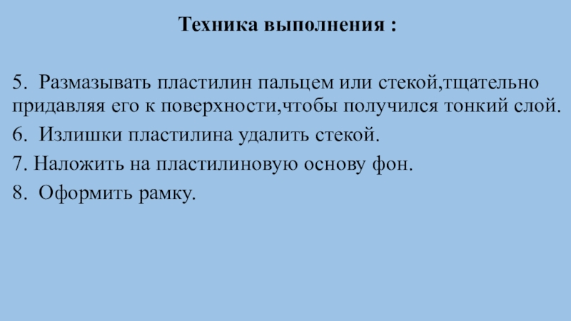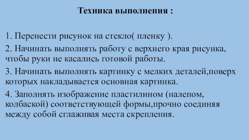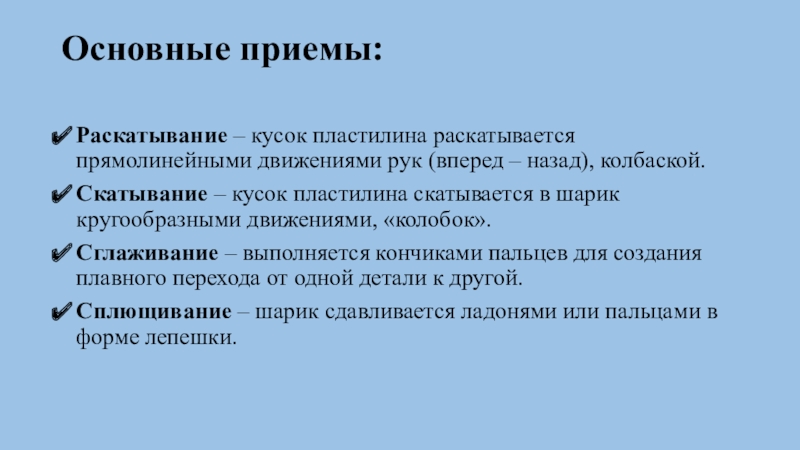 рас-плющивать и видоизменять исходную форму из пластилина, заполнять изображение пластилиновыми налепами соответствующей формы, прочно соединять их между собой, заглаживать места скрепления.
