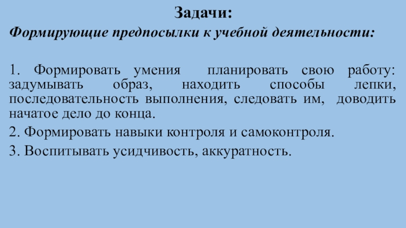 образ, находить способы лепки, последовательность выполнения, следовать им, доводить начатое дело до конца.