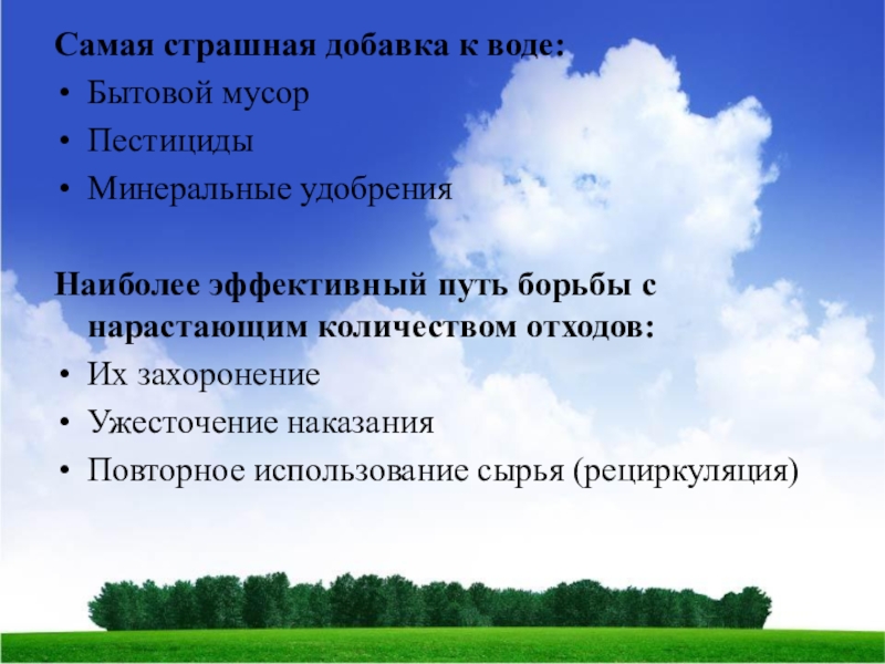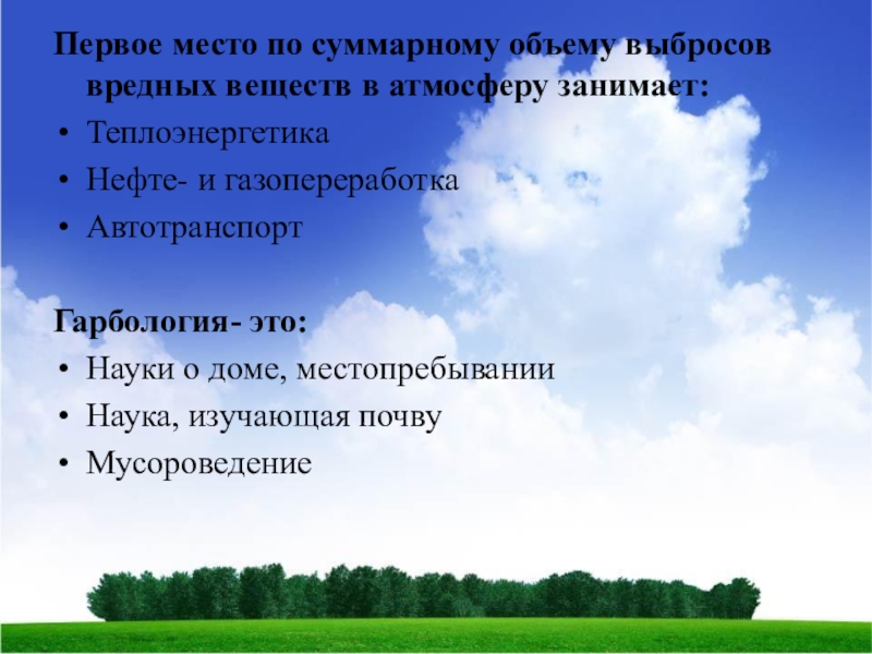 Слайд 30Первое место по суммарному объему выбросов вредных веществ в атмосферу занимает: