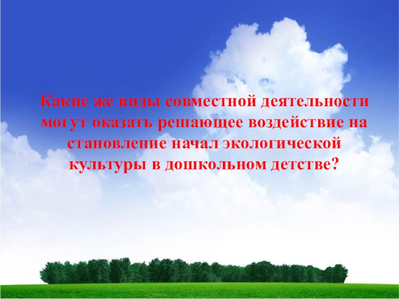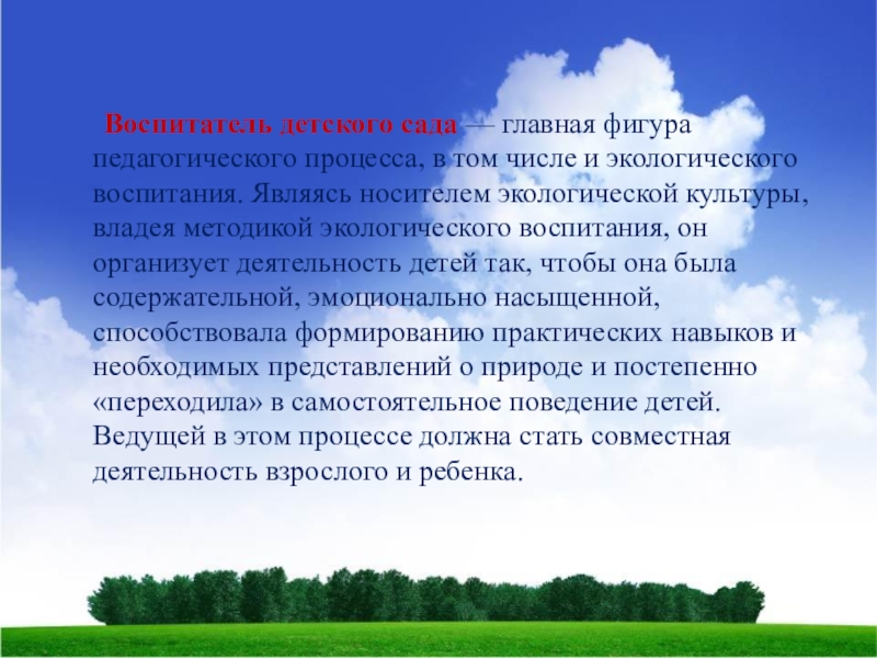 и экологического воспитания. Являясь носителем экологической культуры, владея методикой экологического воспитания, он организует деятельность детей так, чтобы она была содержательной, эмоционально насыщенной, способствовала формированию практических навыков и необходимых представлений о природе и постепенно «переходила» в самостоятельное поведение детей. Ведущей в этом процессе должна стать совместная деятельность взрослого и ребенка.