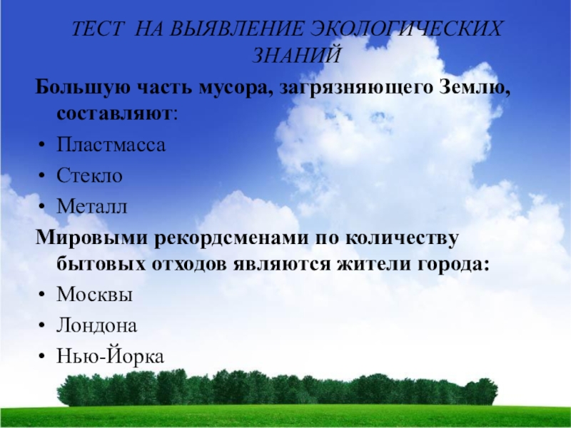 Слайд 25ТЕСТ НА ВЫЯВЛЕНИЕ ЭКОЛОГИЧЕСКИХ ЗНАНИЙ