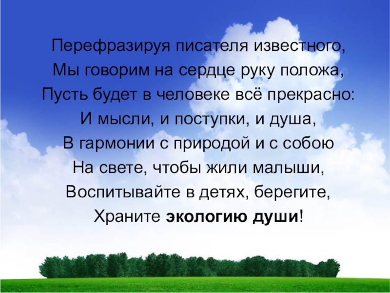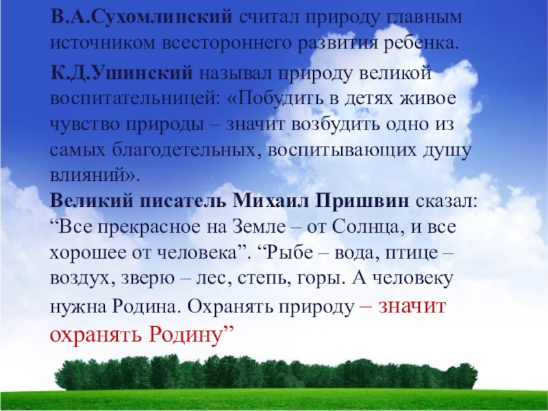 К.Д.Ушинский называл природу великой воспитательницей: «Побудить в детях живое чувство природы – значит возбудить одно из самых благодетельных, воспитывающих душу влияний». Великий писатель Михаил Пришвин сказал: “Все прекрасное на Земле – от Солнца, и все хорошее от человека”. “Рыбе – вода, птице – воздух, зверю – лес, степь, горы. А человеку нужна Родина. Охранять природу – значит охранять Родину”