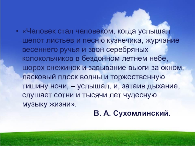 Слайд 2«Человек стал человеком, когда услышал шепот листьев и песню кузнечика, журчание